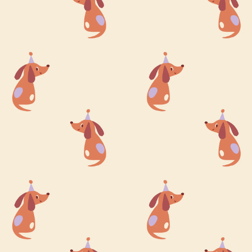 Dessin voorzijde: Party Dog – hondjes met feesthoedjes op crème/lichtgele achtergrond