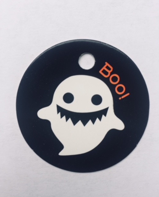 Dit ronde zwarte label met een schattig spookje en oranje tekst “BOO!” maakt elk pakje of traktatie extra feestelijk. De witte achterkant biedt ruimte om iets op te schrijven — perfect voor een korte boodschap, naam of trick or treat-groet.