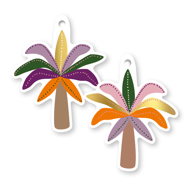 Speelse palmbomen en subtiele gouden dots zorgen voor een label dat meteen opvalt.