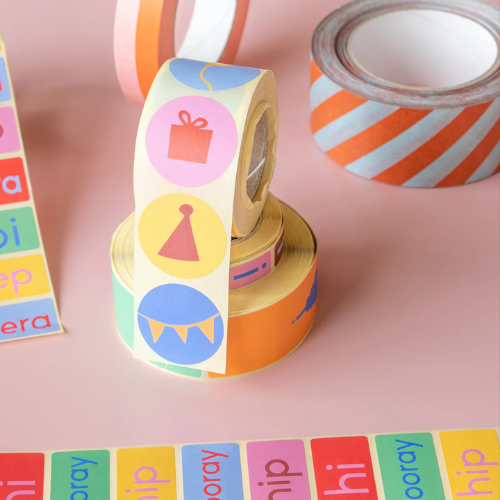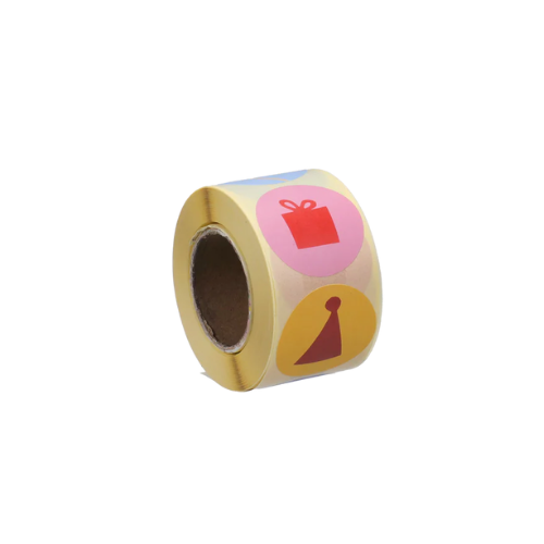 Ballon, cadeau, feestmuts, slinger en taart op een kleurrijke achtergrond.