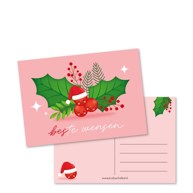 Vergeet de standaard kerstkaart – met deze BESte wensen kaart steel jij de show onder de boom. Het frisse roze design, speelse rode besjes en de vrolijke hulst zorgen voor een hippe twist op de klassieke kerstkaart. Perfect om je kerstgroet nét dat beetje extra karakter te geven.