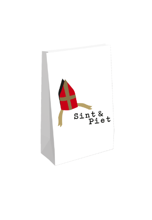 Pak je Sinterklaastraktaties stijlvol in met deze witte blokbodemzakjes, bedrukt met een vrolijke rode mijter en de tekst "Sint & Piet". Deze handige zakjes met een stevige blokbodem zijn perfect voor het verpakken van kleine cadeautjes, pepernoten of traktaties voor kinderen. Ideaal voor iedereen die een feestje willen maken van het Sinterklaasfeest!